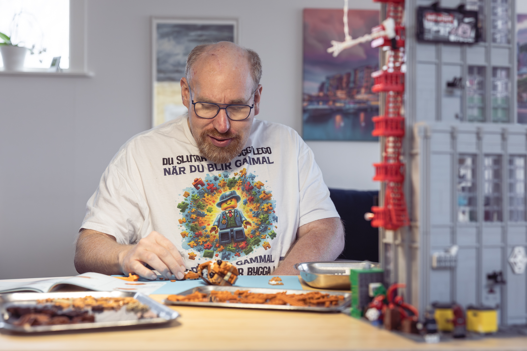Anders sitter vid sitt skrivbord och bygger LEGO, han håller på med en uggla. I förgrunden syns The Daily Bugle, 3 772 bitar.