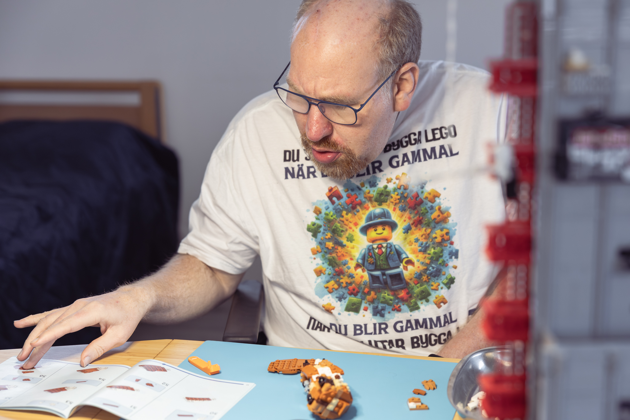 I en villa i Onsala, med utsikt över viken när vädret tillåter, bygger Anders med LEGO flera timmar i veckan. Det som började som ett barndomsintresse har blivit både avkoppling och en del av rehabiliteringen efter en operation som gjorde honom förlamad någonstans mellan 30 och 40 års ålder. Bland superhjältar, radioapparater och huggtandade böcker växer modellerna fram, bit för bit.